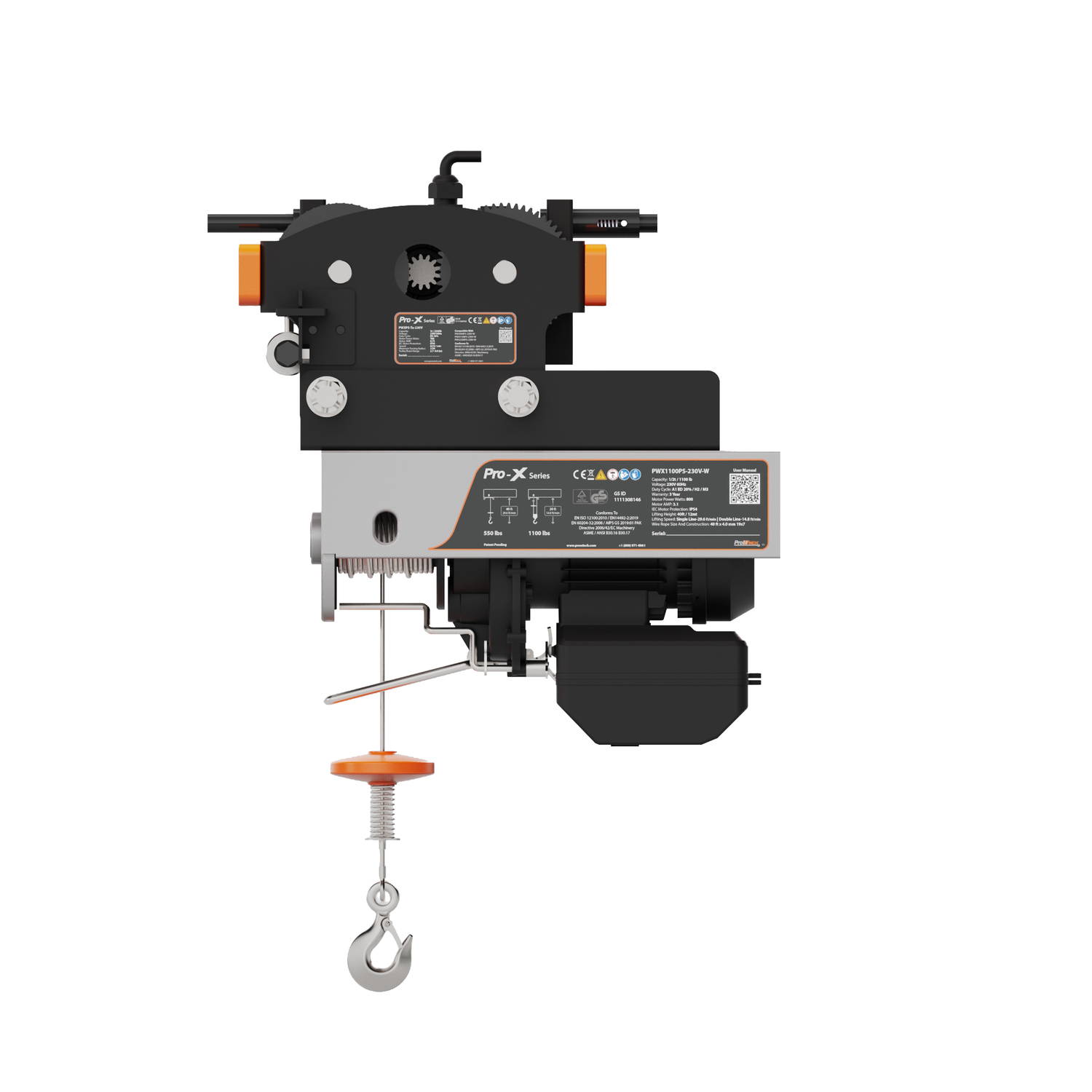 1/2 ton 1100 lb 230V Pro-X Series Electric Wire Rope Hoist w/Trolley 40 ft. Wireless Upper and Lower Limit Switches H3 Duty